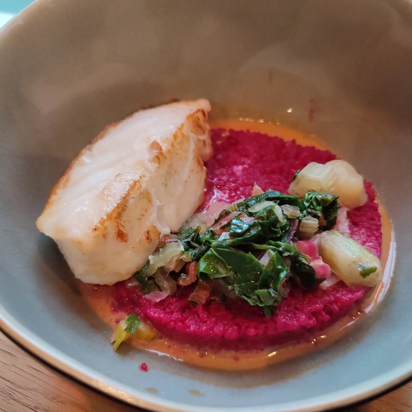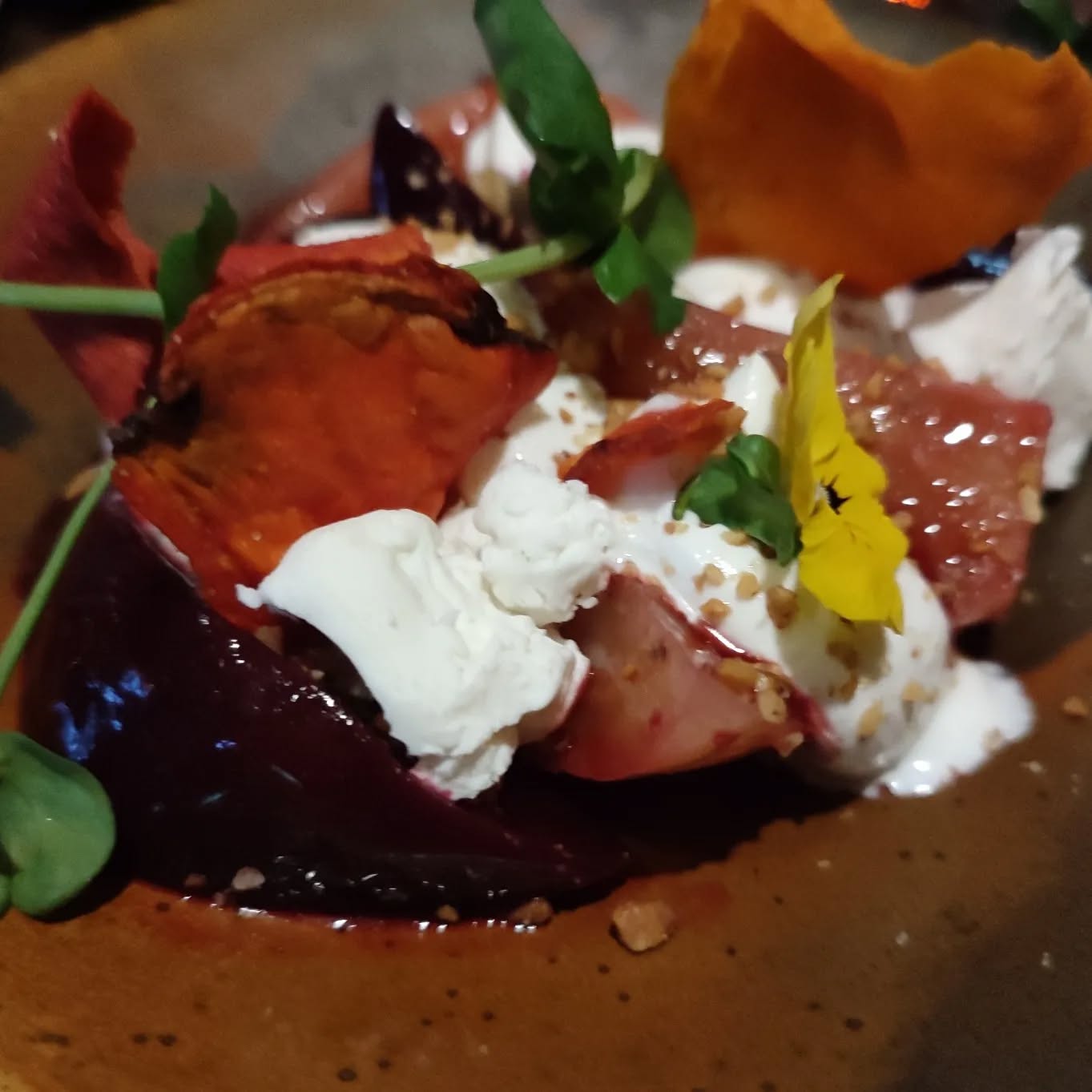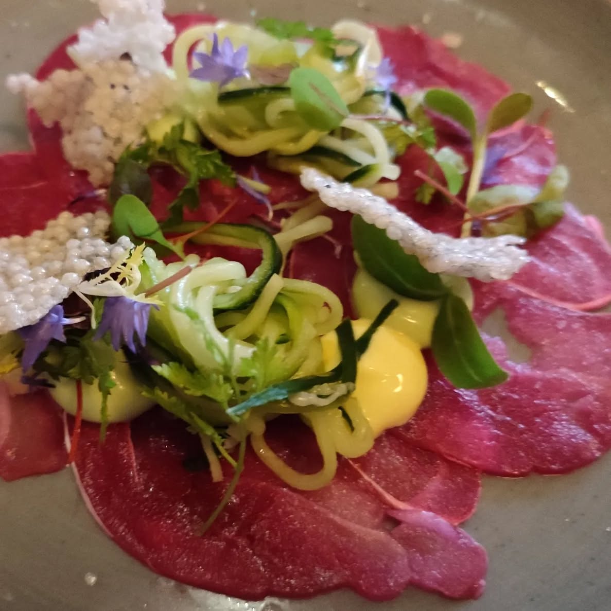 #carpaccio van #kabeljauw #beetroot #ratatouille #biefstuk met #polenta en #spinazie #bloemtop...