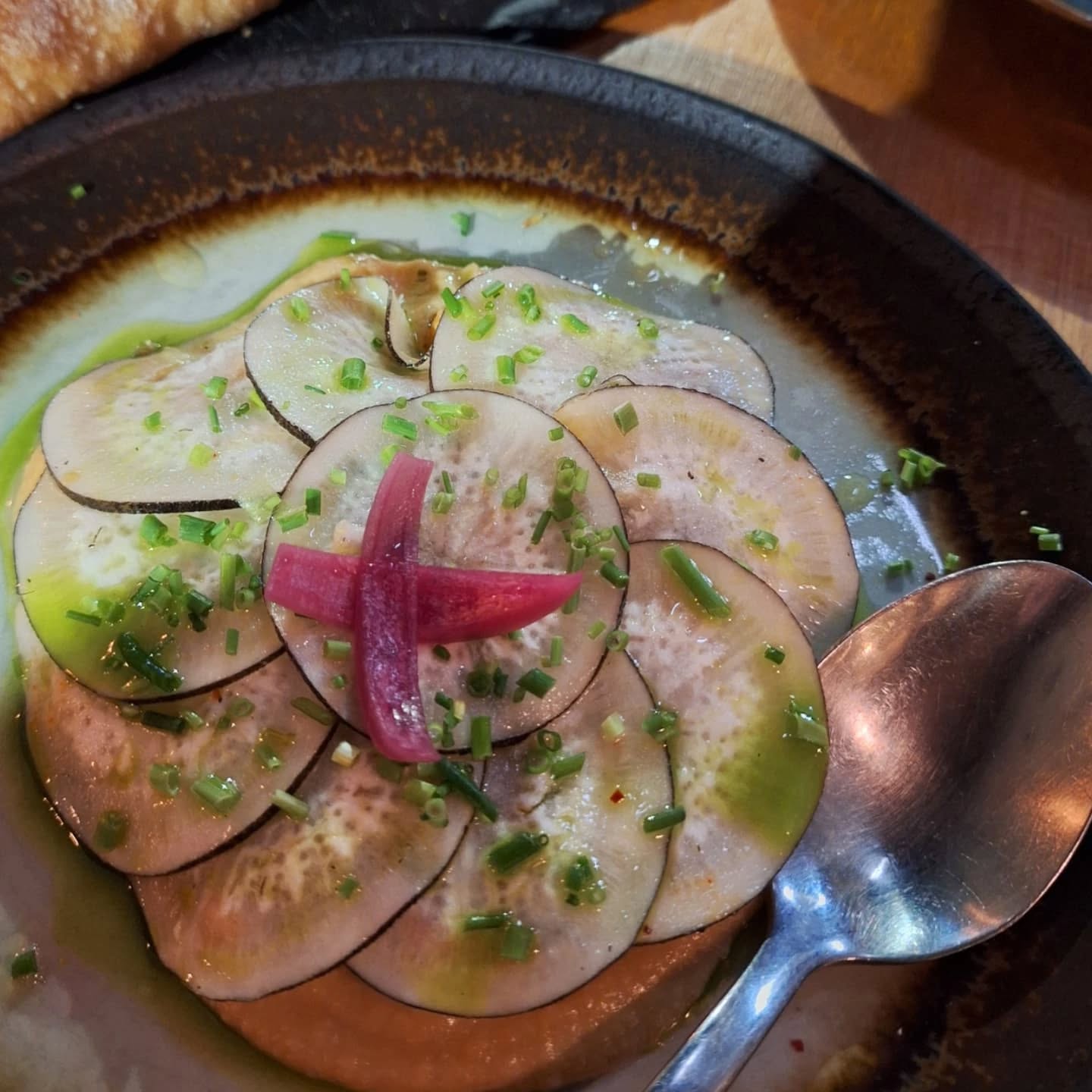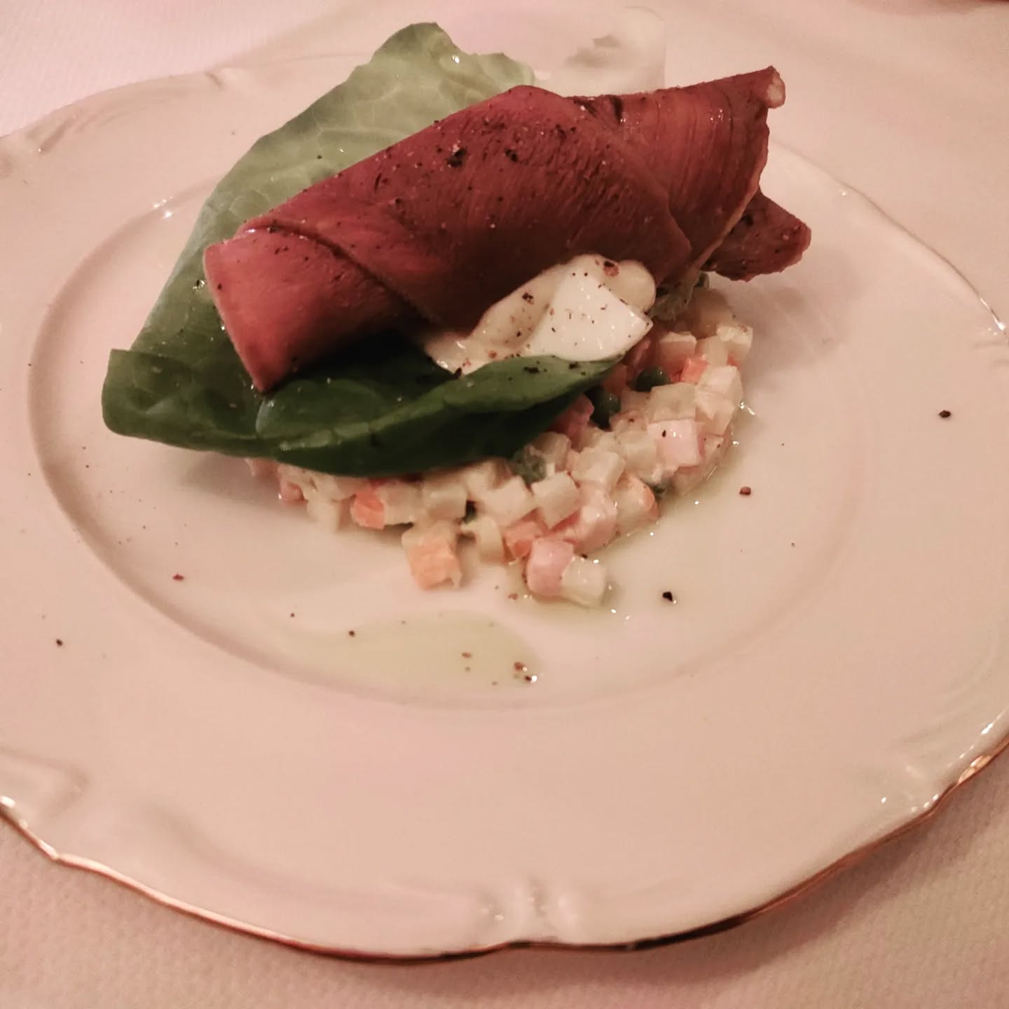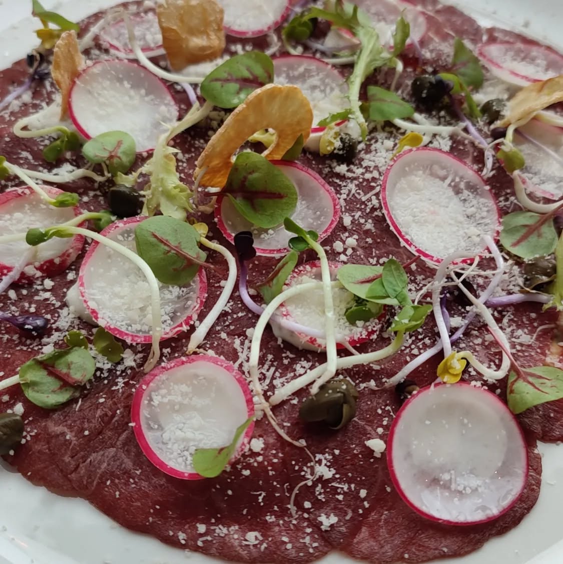 #carpaccio van #kabeljauw #beetroot #ratatouille #biefstuk met #polenta en #spinazie #bloemtop...